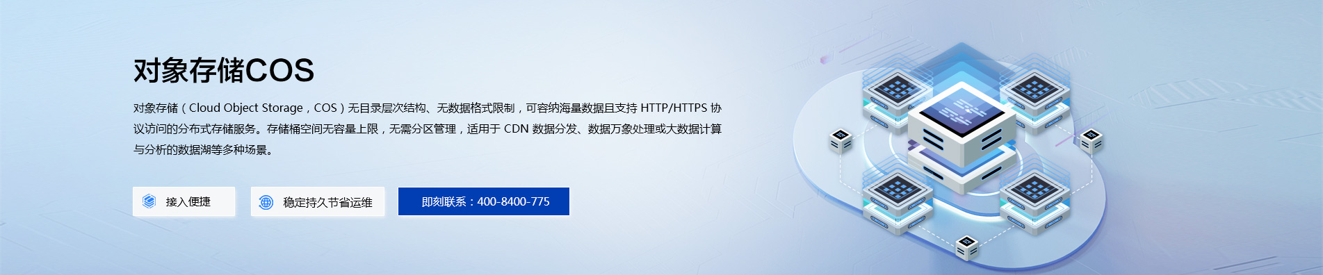 对象存储 COS 是在云上提供无层次结构的分布式存储产品,为用户提供单价较低且快速可靠的数据存储方案。COS 以冗余的方式跨多个可用区存储用户数据,并允许多个不同的客户端或应用程序线程同时对这些数据进行读或写操作。
