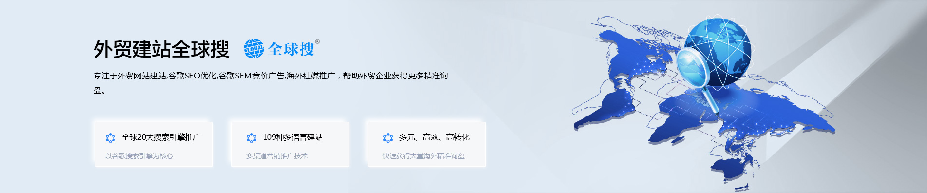 全球搜,是以SaaS平台架构为基础进行外贸建站、以谷歌搜索引擎为核心进行优化推广的— —全球搜索引擎获客 · 一站式解决方案!