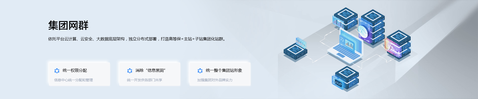 依托平台云计算、云安全、大数据底层架构,独立分布式部署,打造高等保+主站+子站集团化站群。